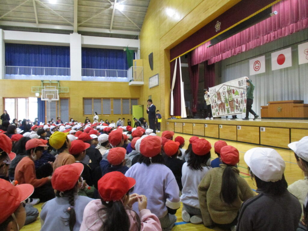 今日は冬休み明け1回目の児童集会がありました。全校で1年の目標を書いたカードを貼って、今年の干支である馬や本校のマスコットのかごりゅうが描かれた1枚の大きな絵を完成させることができました。また、お正月クイズも全員が笑顔で参加し、楽しそうに友達と考えを話し合う姿が見られました。自分で決めた目標を達成できるように、1日1日を大切に過ごしてほしいと思います。