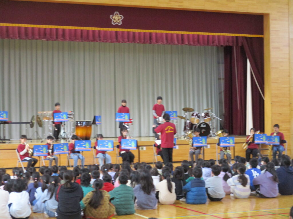 今日は、朝に音楽朝会があり、金管バンドの児童が堂々としたかっこいい演奏を披露してくれました。体育館に響く力強い音色に、全校のみんなが聴き入っていました。